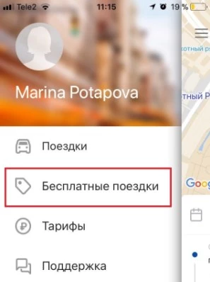 В меню приложения открыть раздел «Бесплатные поездки».
